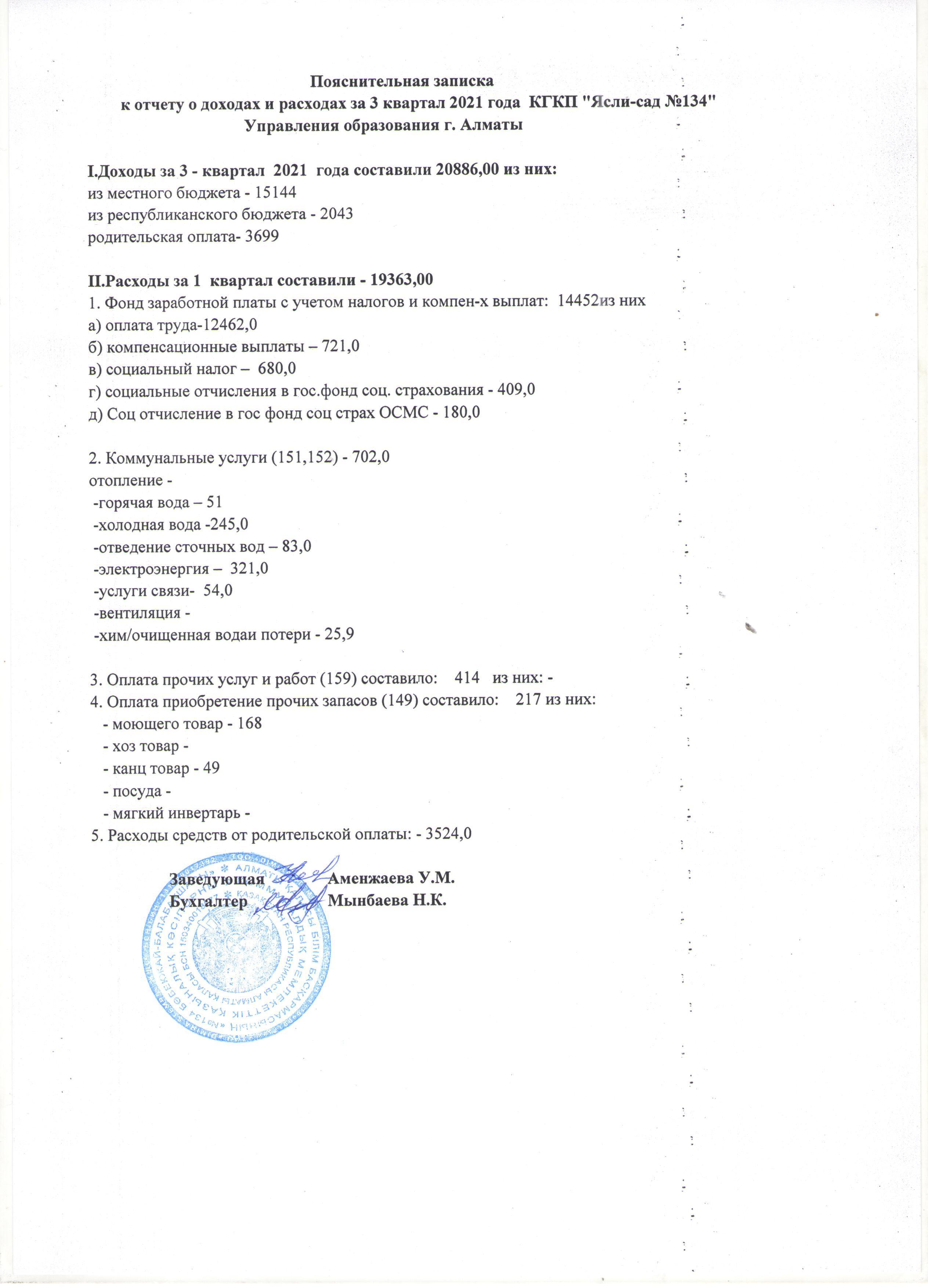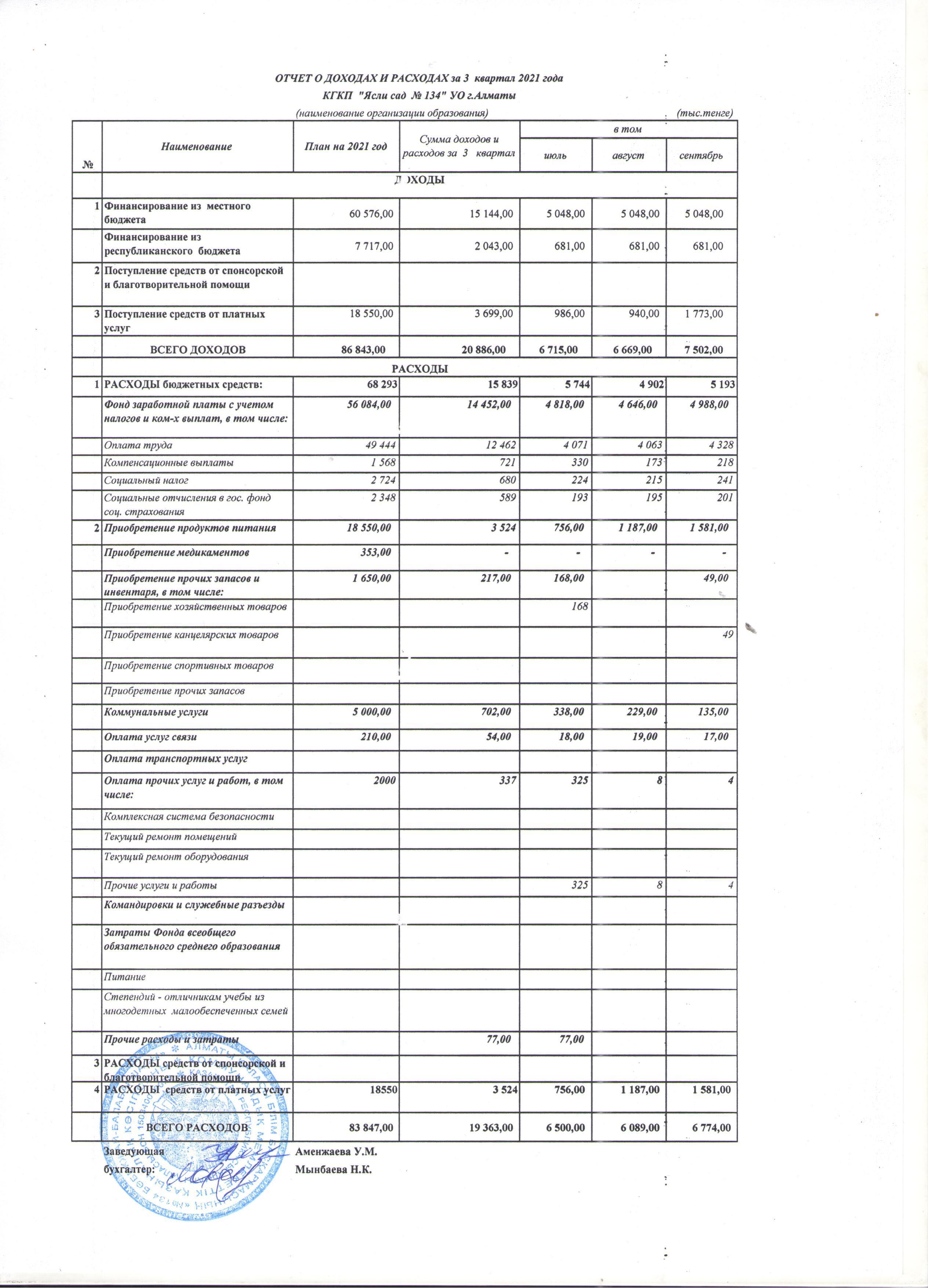 Кіріс және шығыс есебі 3 тоқсан 2021 жыл